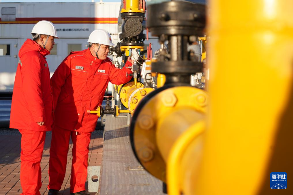 12月4日,在大庆古龙陆相页岩油国家级示范区古页1号站,中国石油大庆油田第九采油厂页岩油生产运行项目经理部生产操作员对站内油气处理设备开展巡检和维护保养工作。新华社记者 王松 摄