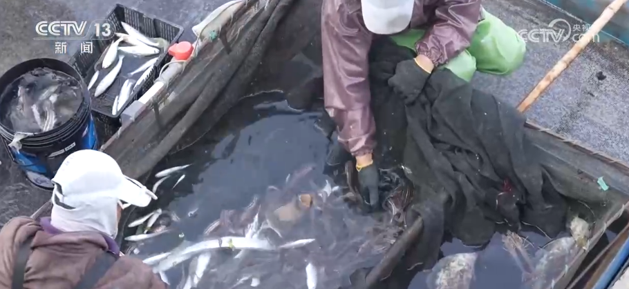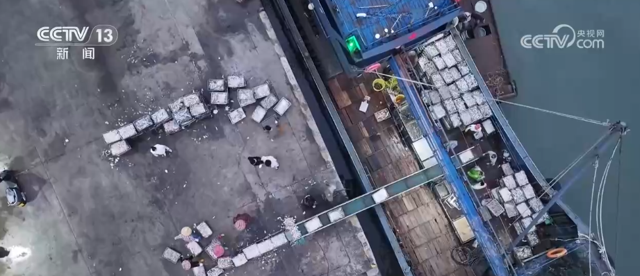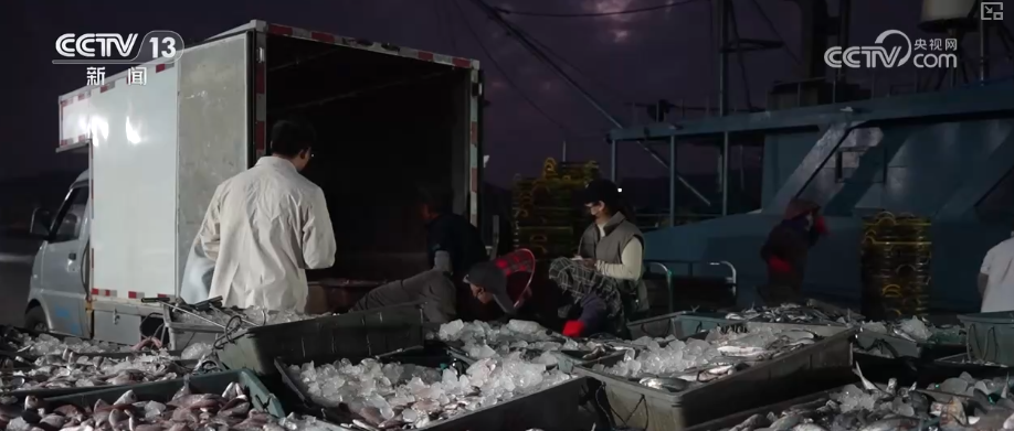 渔获上岸后,随即被装车运往电商分拣中心或加工厂。在海鲜电商林湖斌的作业区,工人们正在分拣新鲜的渔获,经过快速冷处理后,放入保温箱,再用碎冰覆盖、密封加固,通过冷链物流发往全国各地。