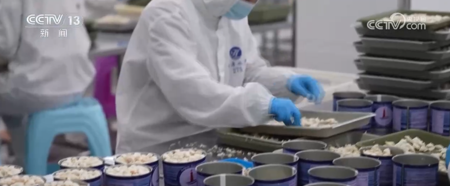 不仅从“海捕”到“上餐桌”的链路高效畅通,澳角村的加工厂也开足马力生产。一部分渔获经过清洗、蒸煮、烘烤,制成虾干、墨鱼干、花蛤干、鳗鱼丝等干货产品。在精深加工车间里,刚上岸的梭子蟹经过剥壳、取肉、加工,则被制成高附加值的蟹肉罐头。