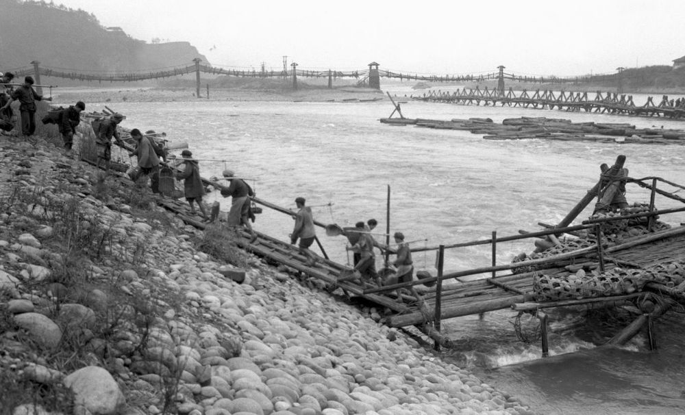四川灌县都江堰的截流工程——杩槎,用它可以将水挡住,以免从外江流入内江(1958年5月整理)。新华社记者 吴化学 摄