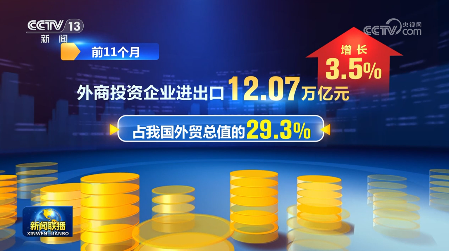 前11个月,民营企业进出口23.52万亿元,增长7.1%,占我国外贸总值的57.1%;外商投资企业进出口12.07万亿元,增长3.5%,占我国外贸总值的29.3%。