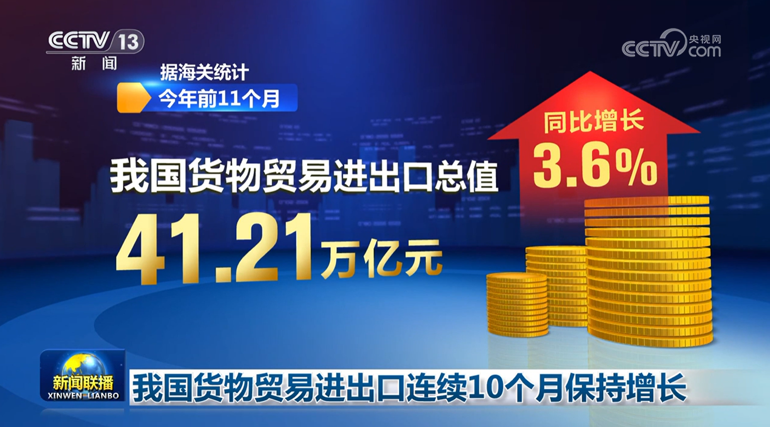 据海关统计,今年前11个月,我国货物贸易进出口总值41.21万亿元,同比增长3.6%。其中,出口24.46万亿元,增长6.2%;进口16.75万亿元,增长0.2%。