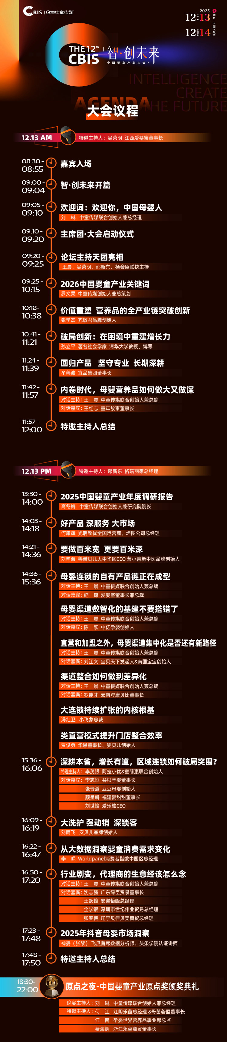 距离行业年度盛宴启幕,仅剩最后三天!2025年12月13日至14日,第十二届CBIS中国婴童产业大会将在北京拉开帷幕。本届大会以「智·创未来」为主题,已进入最后的筹备冲刺阶段。一个汇聚顶尖思想、展示创新成果、链接产业资源的顶级平台即将亮相,备受业界期待。