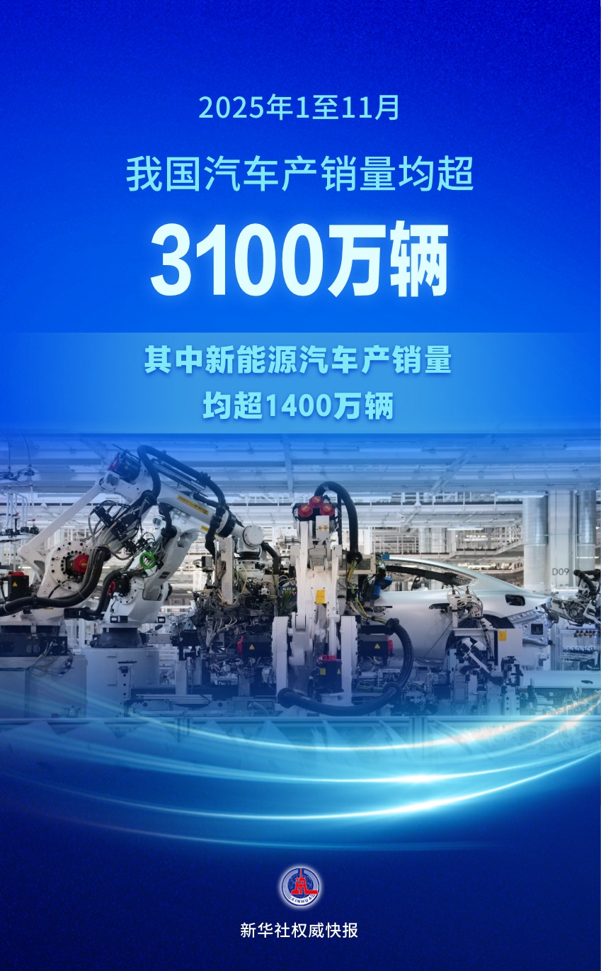 来源标题:前11个月我国汽车产销量双超3100万辆