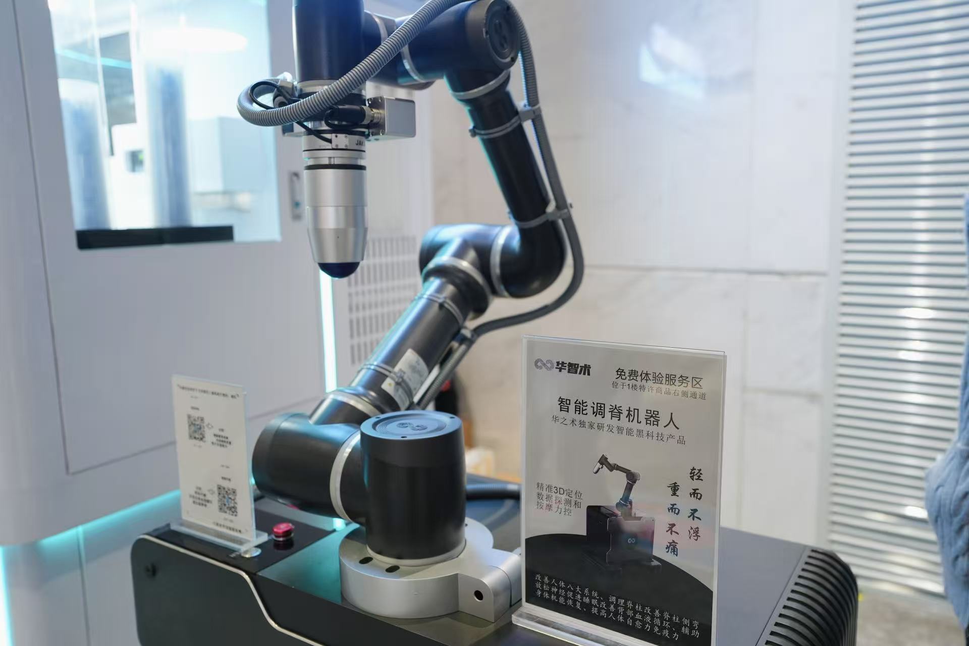 △科技助残产品展示体验区上的一台智能调脊机器人
