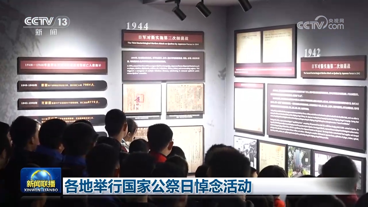 在中国人民抗日战争纪念馆,来自首都社会各界代表、学校师生等,向南京大屠杀死难者默哀。现场,青年学生们朗诵《和平宣言》并庄严宣誓。在上海淞沪抗战纪念馆胜利广场,人们向无名英雄纪念碑敬献鲜花,表达追思。在辽宁沈阳“九·一八”历史博物馆,参加公祭仪式的人们秉烛致哀,深切缅怀南京大屠杀遇难同胞。