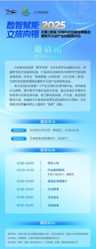 在数字经济浪潮席卷全球的今天,文旅产业正迎来前所未有的“智变”机遇。为积极响应国家“数字中国”与文化数字化战略,推动文旅产业与数字科技深度融合,“数智赋能·文旅向锡——2025无锡(梁溪)文旅科技创新发展峰会暨数字文旅产业招商恳谈会”将于2025年12月19日在无锡君来洲际酒店隆重举行。