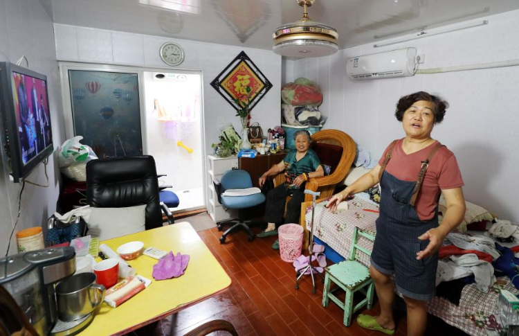 宝昌路731弄居民李才英(右)和她92岁的母亲在家中看电视,左前侧是她家完成改造的新卫生间,不用再为“拎马桶”烦恼(2019年7月18日摄)。新华社记者方喆摄
