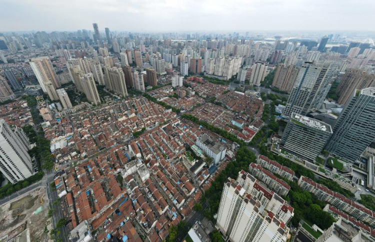 空中俯瞰上海市黄浦区建国东路68街坊和67街坊东块所在区域(无人机照片,2022年7月21日摄)。7月24日凌晨,上海市黄浦区建国东路68街坊和67街坊东块的房屋征收签约率突破90%。新华社记者方喆摄