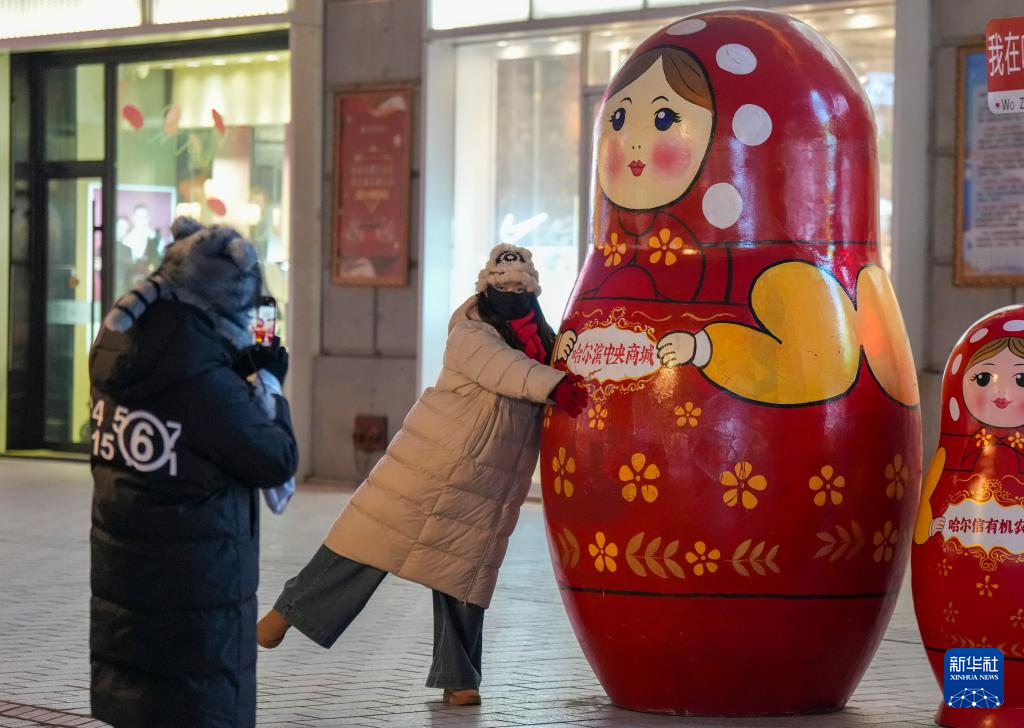 12月16日,人们在哈尔滨中央大街上的一处套娃景观前拍照。新华社记者 王松 摄