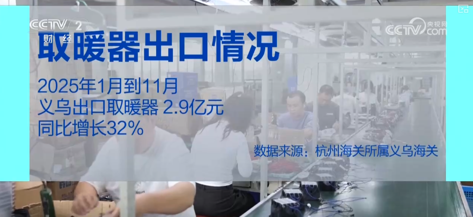 海关数据显示,2025年1—11月,宁波出口取暖器53.4亿元。其中,出口欧盟17.1亿元,同比增长12.3%;出口东盟1.7亿元,同比增长3.1倍。2025年1—11月,义乌出口电暖器2.9亿元,同比增长32%。