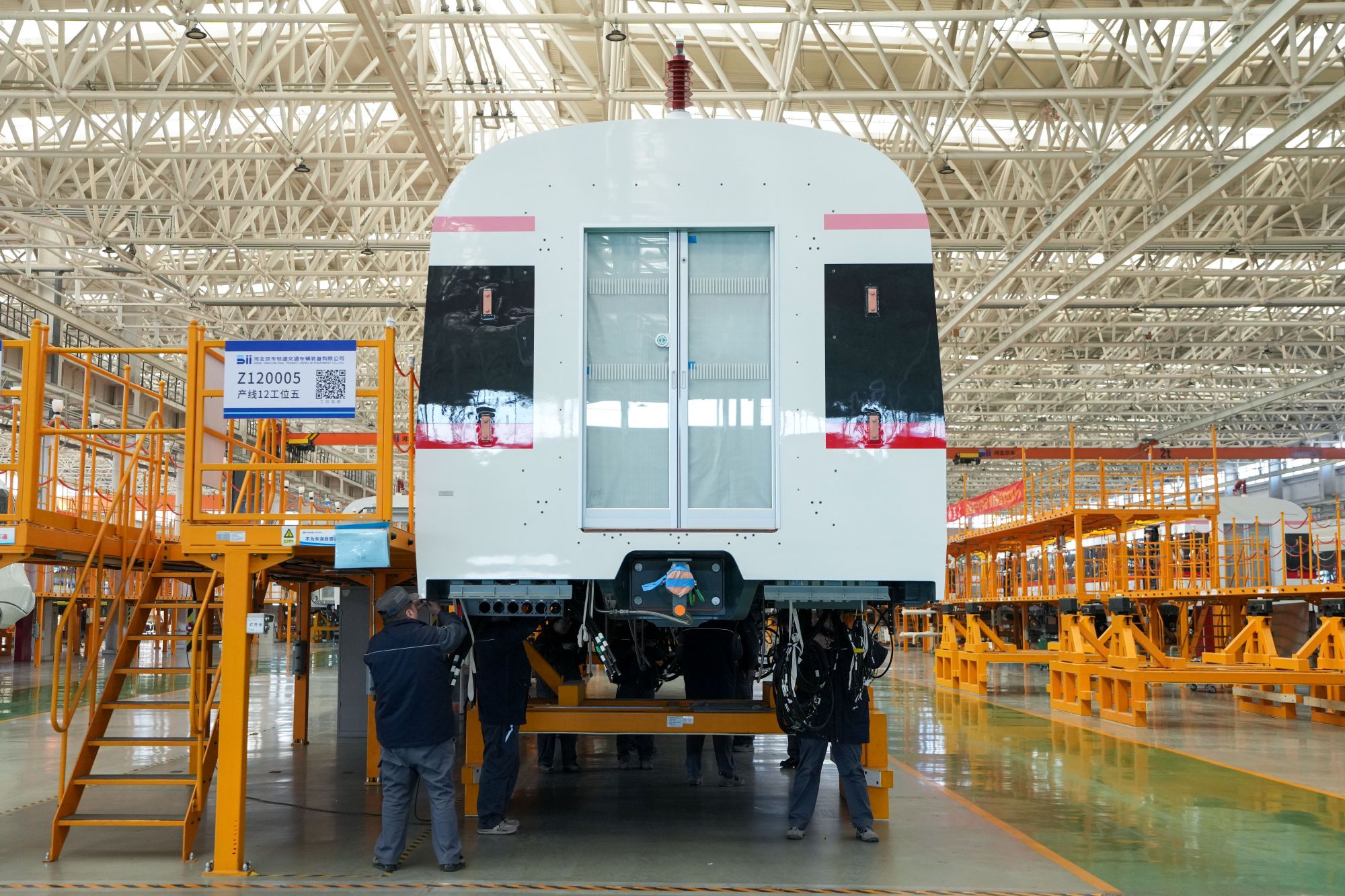 在京投装备河北京车智能制造基地,工作人员在地铁列车总装车间内工作(2025年2月14日摄)。京投装备河北京车智能制造基地位于河北省保定市,采用“北京研发+河北制造” 模式运营,是贯彻京津冀协同发展战略的重要项目。新华社记者 鞠焕宗 摄