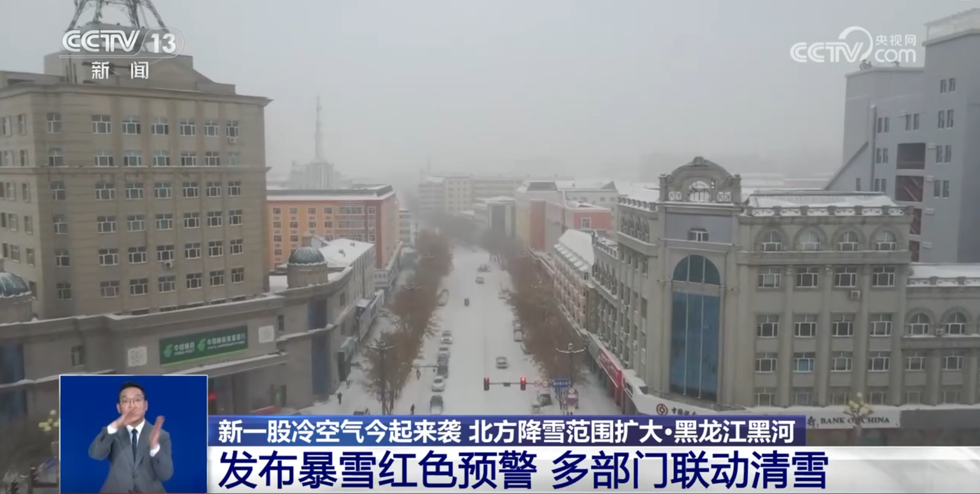 从18日夜间开始,黑龙江黑河的北安市、嫩江市都出现了降雪天气。19日11时30分,黑河市气象台发布暴雪红色预警。
