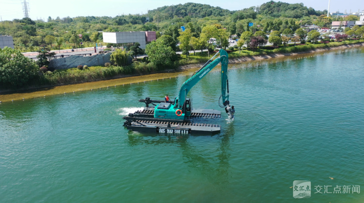 只见一台身披“山河绿”的水陆两栖挖掘机稳稳地在水中行驶。驾驶室里的工程师轻拉摇杆,这个足有两层楼高的“钢铁巨兽”便灵活转身,履带划过水面,泛起层层涟漪——轻巧的身姿完全颠覆了人们对挖掘机“只能在地上笨重行走”的固有印象。