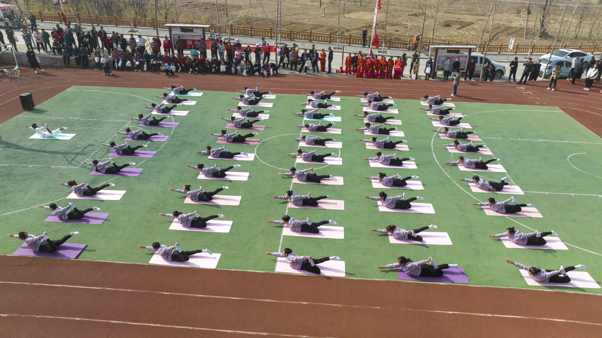村民在操场练瑜伽。阜平县委宣传部供图