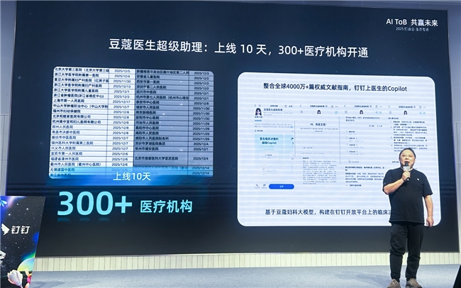 在 2025 钉钉1.1新品发布暨生态大会上,壹生检康创始人兼 CEO 王强宇分享了一个令行业侧目的数据:其基于钉钉开放平台打造的“豆蔻医生超级助理”,在上线短短 10 天内,便有超过 300 家医疗机构主动开通使用,有北上广的国内顶尖三甲医院,也有来自阿拉善和阿克苏偏远地区的基层医院。
