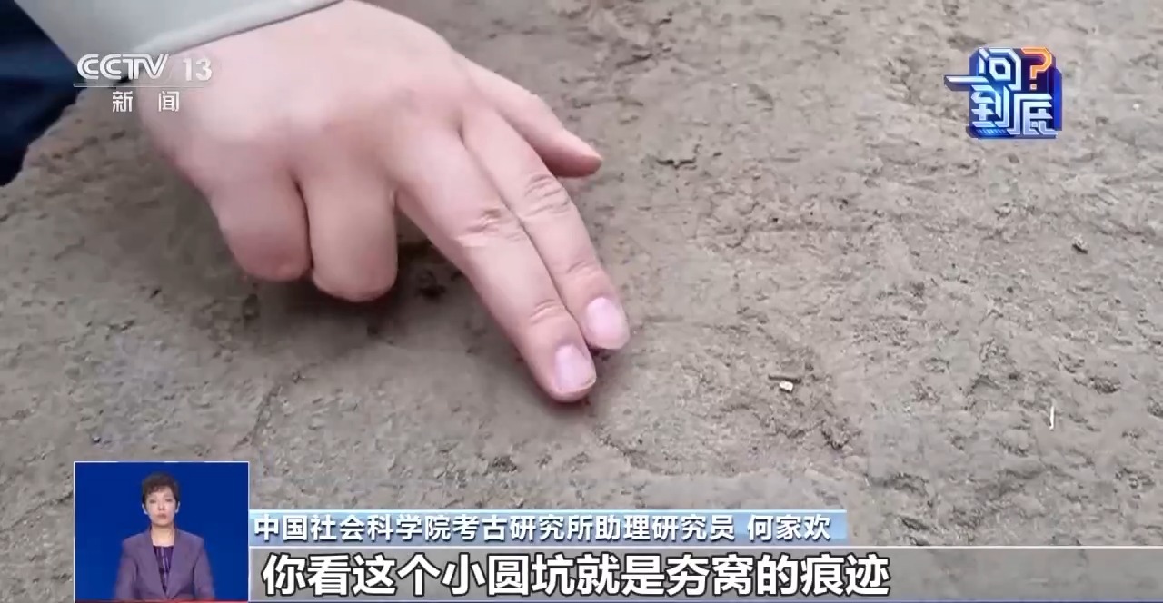 中国社会科学院考古研究所助理研究员 何家欢:你看这个小圆坑就是夯窝的痕迹,很明显有这么条线,在每一层夯土都有这么个线,位置也基本差不多,我们怀疑这个线当时作为两个施工队的分界线。