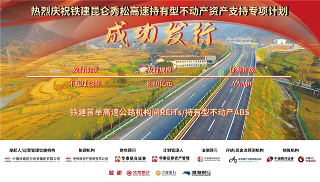 “铁建昆仑秀松高速持有型不动产资产支持专项计划”于2025年12月23日于上海证券交易所成功发行,本项目为中国铁建集团首单高速公路机构间RETIs/持有型不动产ABS,由华泰证券(上海)资产管理有限公司担任计划管理人,项目通过簿记建档方式共发行810万张资产支持证券,合计登记总规模为8.10亿元,发行期限不超过22年。
