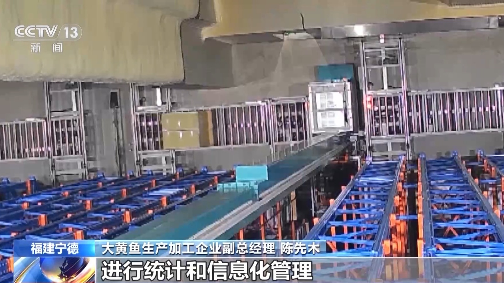 大黄鱼生产加工企业副总经理 陈先木:我们的智能冷库一共有13层,高38米,库内容量达到1.5万吨。它能够全天24小时不间断装卸货物,自动进行货物的智能存取、搬运、分拣,同时,通过扫码出入库,系统还能精确对大批量的货物进行统计和信息化管理。