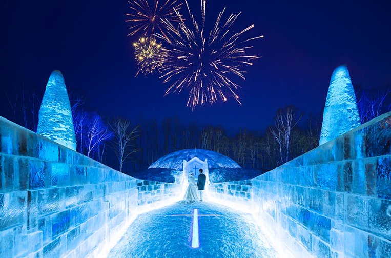 作为度假村内冬季极具象征性的建筑,冰之教堂每年仅在约1个月的限定期间内现身。教堂以“一片冰”无缝打造完成,代表“二人纯粹的情感永不间断”,包括神坛、十字架、长椅等所有细节皆由冰与雪组成。透明度极高的冰面折射光线,让空间被称为“冰蓝光(IceBlue)”的梦幻光芒所覆盖。
