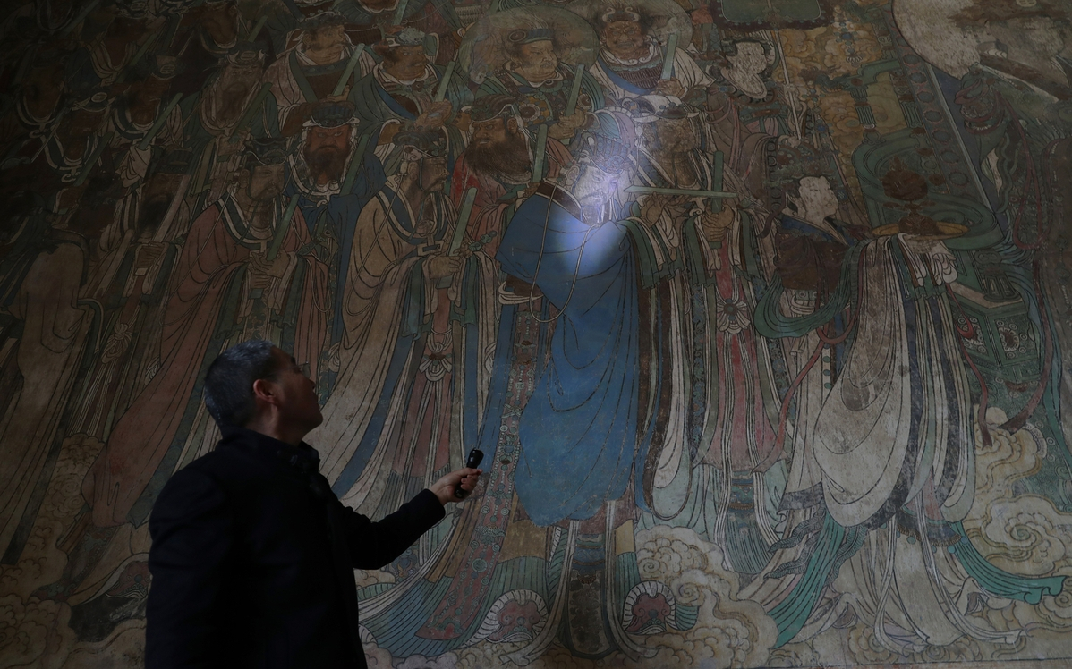 2023年3月28日,山西运城,时任永乐宫壁画保护研究院院长的席九龙介绍三清殿壁画的起甲、脱落、粉化等病害问题。2021年开启永乐宫搬迁后首次大规模修复,已经完成了龙虎殿、重阳殿548平米壁画病害处理和保护性修复,为下一步开展三清殿及纯阳殿壁画修复保护工作打下良好基础。中国日报记者 邹红 摄