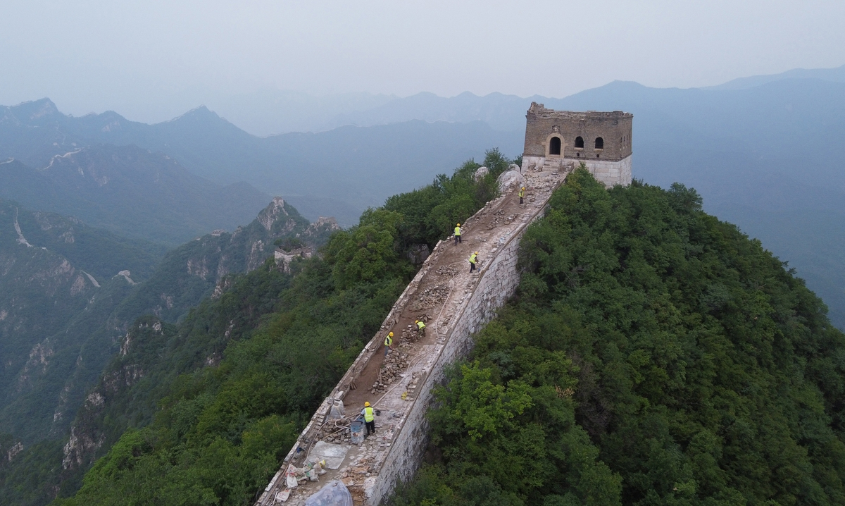 2024年7月9日,箭扣长城正北楼附近,工人正在施工。当年箭扣长城五期保护修缮项目开工。中国日报记者 邹红 摄