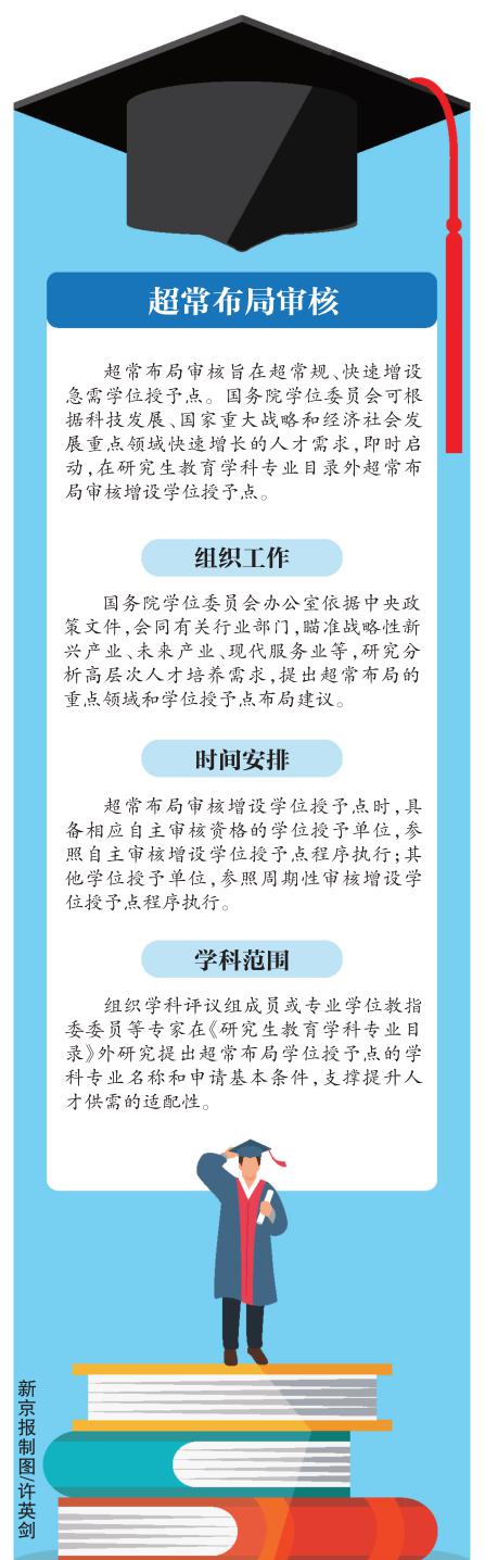 当前,新一轮科技革命和产业变革深入发展,技术创新进入密集活跃期,我国科技发展、国家重大战略和经济社会发展重点领域对高层次人才需求快速增长,急需建立超常布局审核工作机制,根据需求即时启动、快速布局学位授予点。2025年6月,为落实中央关于推进低空经济高质量发展的有关部署,教育部围绕低空技术与工程的关键急需方向开展超常布局试点,部署24所学位授予资格自主审核高校增设了低空技术与工程相关学位授予点。
