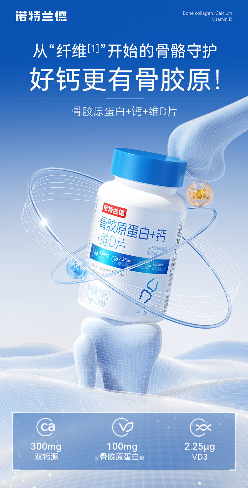 基于对系统性营养需求的理解,诺特兰德推出的骨胶原蛋白+钙+维D片。它并非简单地将几种营养素叠加,而通过钙、维生素D3与骨胶原蛋白的协同作用,为骨骼健康提供多维度的营养支持,从不同层面回应中老年骨骼的复杂营养需求。在实现“协同”的基础上,诺特兰德进一步追求“精准高效”。例如,在钙源选择上,采用包括天然乳矿物盐钙在内的双钙源,其天然的2:1钙磷比更亲和人体;维生素D3的添加则助力钙的运输;骨胶原蛋白的引入,则是从底层为骨骼搭建更牢固的营养支撑网络。