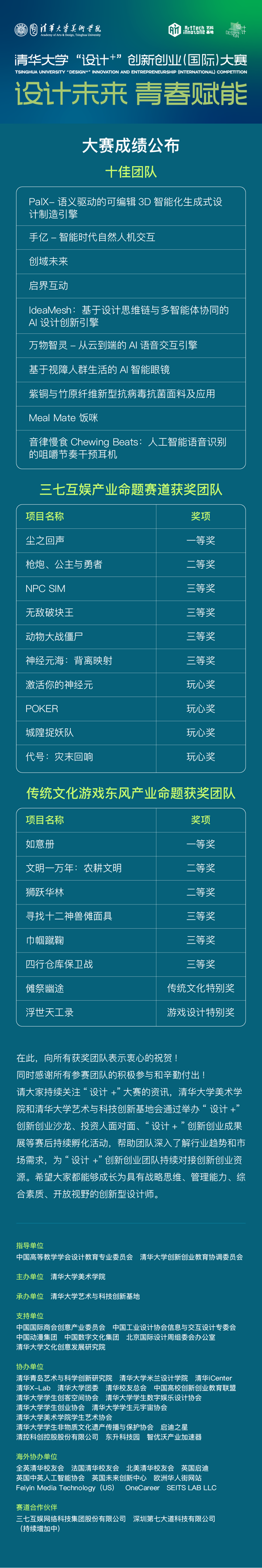 2025年12月13日,清华大学2025“设计+”创新创业(国际)大赛总决赛在清华大学美术学院落幕。本届大赛是由清华大学美术学院主办,清华大学艺术与科技创新基地承办的国际性设计创新创业赛事。