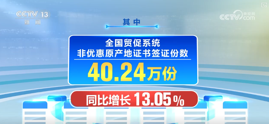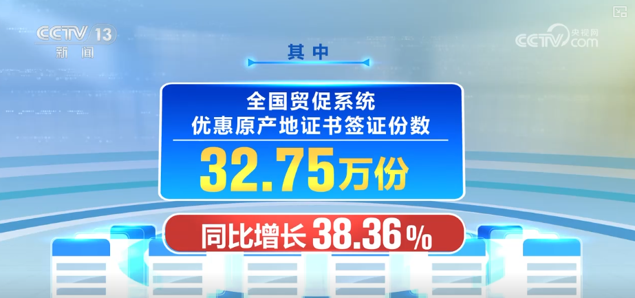 其中,全国贸促系统非优惠原产地证书签证份数为40.24万份,同比增长13.05%;优惠原产地证书签证份数为32.75万份,同比增长38.36%;RCEP原产地证书签证份数为34789份,同比增长30.01%。