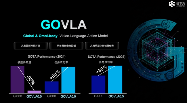 从 2024 年 6 月率先发表 VLA 研究成果、引入 Mamba 架构推出 RoboMamba(GOVLA 0.0),到后续发布全球首个快慢系统深度融合的 FiS-VLA 模型(GOVLA 0.5),其性能相较国际标杆模型 π0 提升约 30%。在前面两个开源版本基础之上,目前,智平方已研发出更为强大的 GOVLA 1.0 版本。