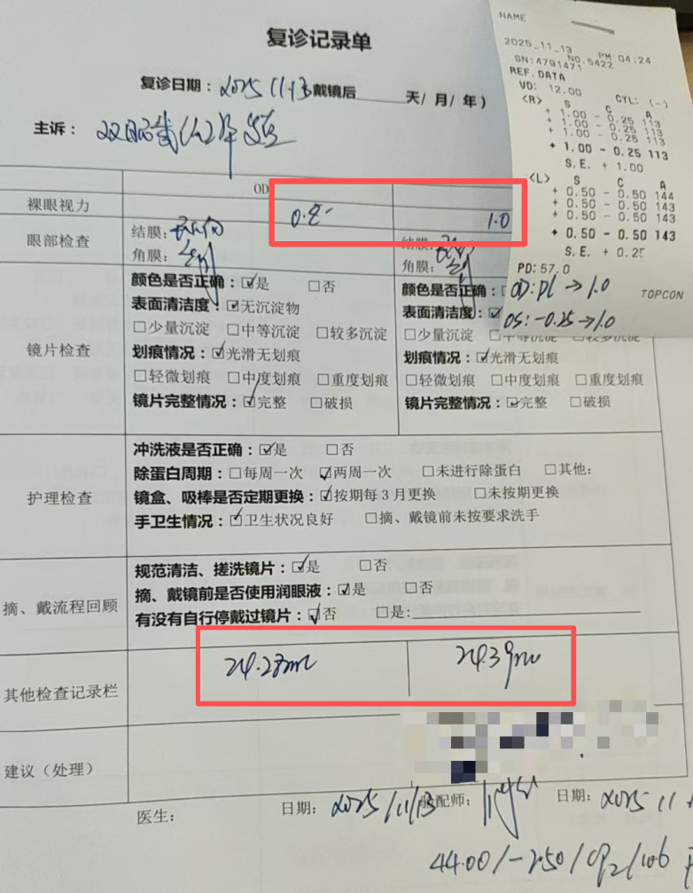在明确诊断后,刘巧萍主任提出为孩子更换度数准确的眼镜。考虑到小冯年仅12岁,但眼轴长度(右眼24.00mm,左眼24.11mm)已超过同龄人正常水平,近视加深的风险较高,刘主任建议采取更积极的防控措施——验配角膜塑形镜(OK镜)。