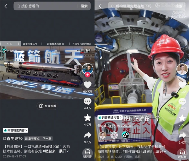 还有一些创作者深入重大事件现场,以第一视角为网友拍摄宝贵画面。@直男财经 在抖音的支持下,对火箭公司蓝箭航天的朱雀三号火箭进行了长达4个月的贴身追踪拍摄,深入火箭制造车间、火箭发射场,其制作的抖音独家视频《一口气说清可回收火箭》,运用三维建模技术模拟核心技术环节,让不少网友第一次了解可回收火箭如何回收。财经领域也有更多作者走向现场实拍,@饭统戴老板 深度调研一年开一万家的零食店,@小Lin说 独家探访地下58米全球最长海底高铁隧道,以实地体验让高密度知识更好理解。