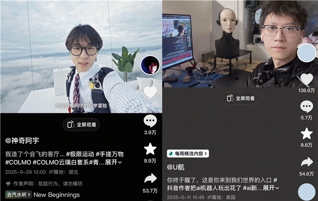 科技创作领域,新生代青年作者令人耳目一新。00后创作者@神奇阿宇 手搓了一个“会飞”的客厅,他亲手拧了一万多颗铆钉,组装了定制家具,最终让这个客厅搭载热气球飞上2000米高空。出生于1997年的@U航 在哥伦比亚大学读博期间开始抖音创作,在粉丝的见证下发顶刊论文毕业,创业做人脸机器人的研发,如今他创立的公司首形科技一年时间融资5次,被抖音网友亲切称为“养成系AI霸总”。女性创作者同样在科技内容上活跃,@秋芝2046 年初作品《DeepSeek实用技巧》讲解如何快速上手使用AI工具,吸引众多网友在评论区“拜师”感谢;@苏打baka 自制可变形的导弹造型路由器,让WiFi信号覆盖全小区。