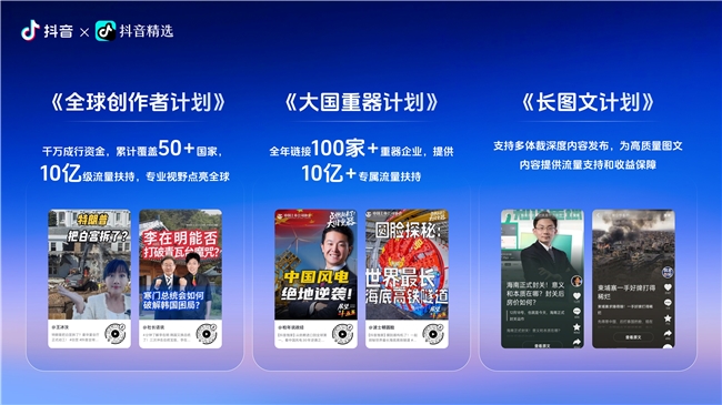 在重点知识领域,抖音知识还将推出多个创作计划。其中,“全球创作者计划”将提供千万元成行资金,支持创作者在超50个国家拍摄优质内容,打造一系列“全球代表作”;“大国重器计划”计划全年撮合创作者链接超100家重器企业,提供超10亿专属流量扶持,带网友领略国之重器的硬核浪漫。“专业合伙人计划”将深入法律、医疗等行业,为100位合伙人提供深度内容赋能,一起做出行业尊重、用户认可的优质内容。