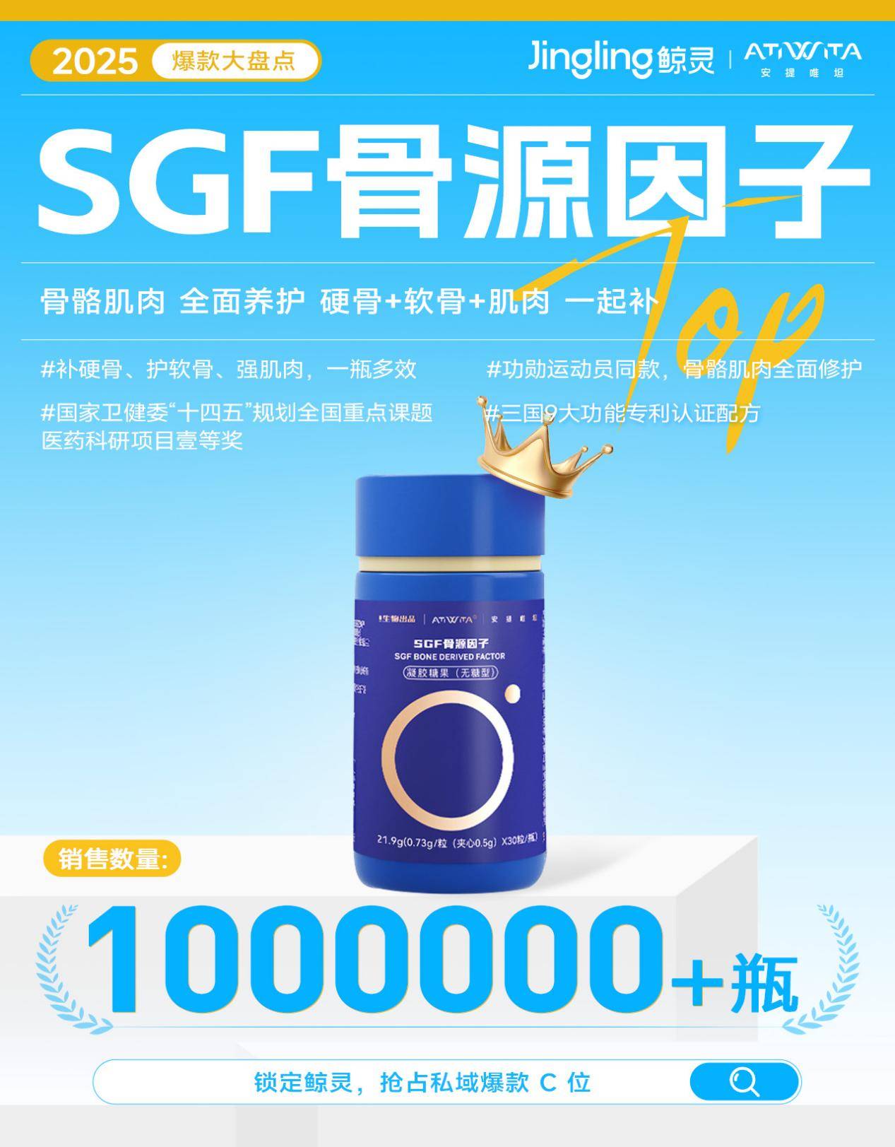 2024 年 8 月 20 日,我们与鲸灵的合作正式启动,安提唯坦SGF骨源因子在鲸灵重磅上线,首档销售额突破300万,后续战绩持续飙升,2025年终盛典溯源大档首日销售额突破1080万,上线15个月总销售额突破1亿,双方携手创下骨肌养护品类销售奇迹。