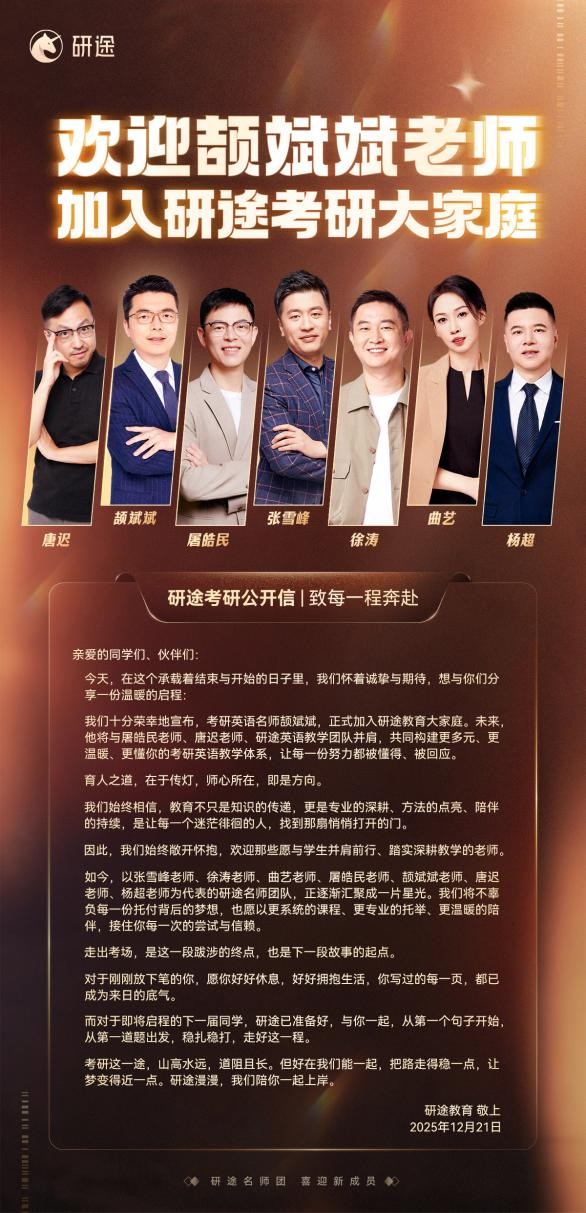 显然,教育品牌的价值不仅在于课程的专业深度,更在于能否持续整合优质教育资源、构建科学教学体系,真正做到与考生并肩前行。长久以来,研途教育始终围绕“更懂考研、更懂你”的品牌理念,不断夯实教学矩阵,提升服务能力。为进一步强化英语教学体系的专业厚度与多元支持能力,研途于12月21日正式宣布与考研英语名师颉斌斌达成独家合作。此次携手,将为广大考研学子提供更适配的备考陪伴。