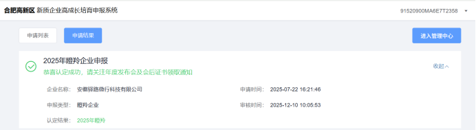 近日,合肥高新区2025年度瞪羚企业榜单正式揭晓。安徽驿路微行科技有限公司(以下简称“驿路微行”)凭借其持续的创新实力与市场表现,连续第三年荣膺“合肥高新区瞪羚企业”称号。