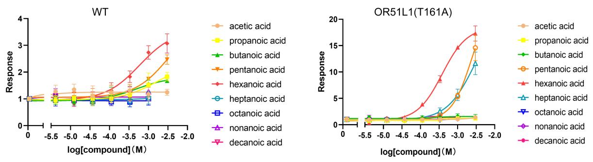 图2 OR51L1蛋白改造前后对不同链长脂肪酸的响应情况对比