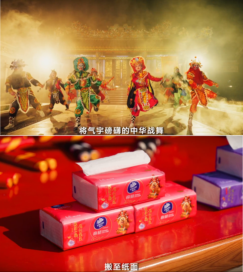 维达的非遗之旅,始于对文化本源的探寻。2025年1月,品牌联合达人制作非遗英歌舞溯源纪录片,深入挖掘这一古老舞蹈的历史脉络。同时,维达将舞狮、英歌舞等元素融入与国民IP《熊出没》的联名款产品中,打造“福气”包装,把纸巾变成非遗文化的载体之一,让优秀的传统文化从“遥望”到“触手可及”。