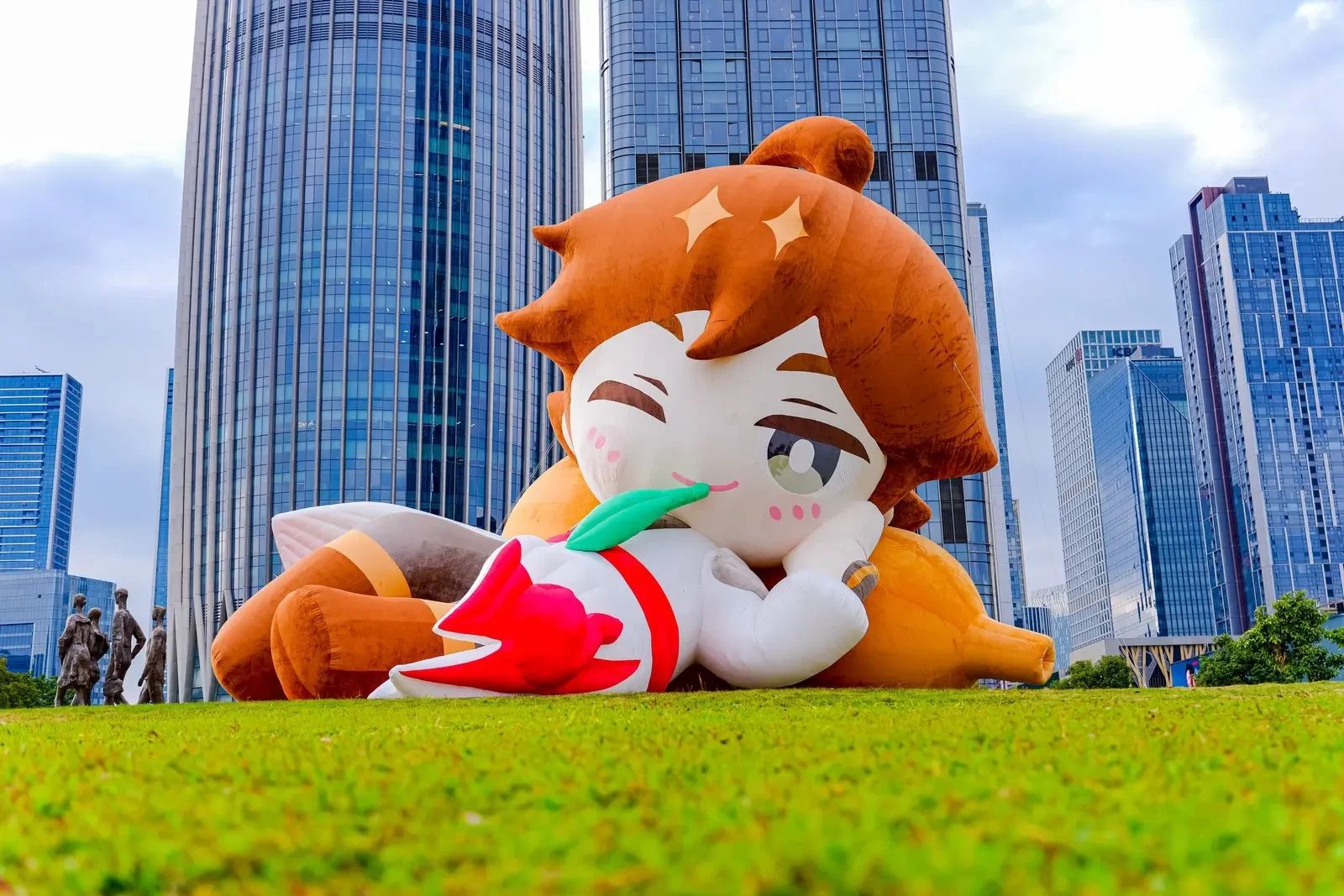 与传统的封闭式展会不同,本次派对将会场置于开放的深圳人才公园,这彻底改变了活动的气质,创造了一种独特的“公园松弛感”:全球最大的“李白”气模斜倚山坡、首个“朵莉亚”水上气模引人注目、大湾区首秀的“无限王者团”四处与游客合影、“无限王者”主题市集开售大量周边......在这里,高浓度的IP氛围被巧妙稀释,与市民的日常休闲生活无缝交融。