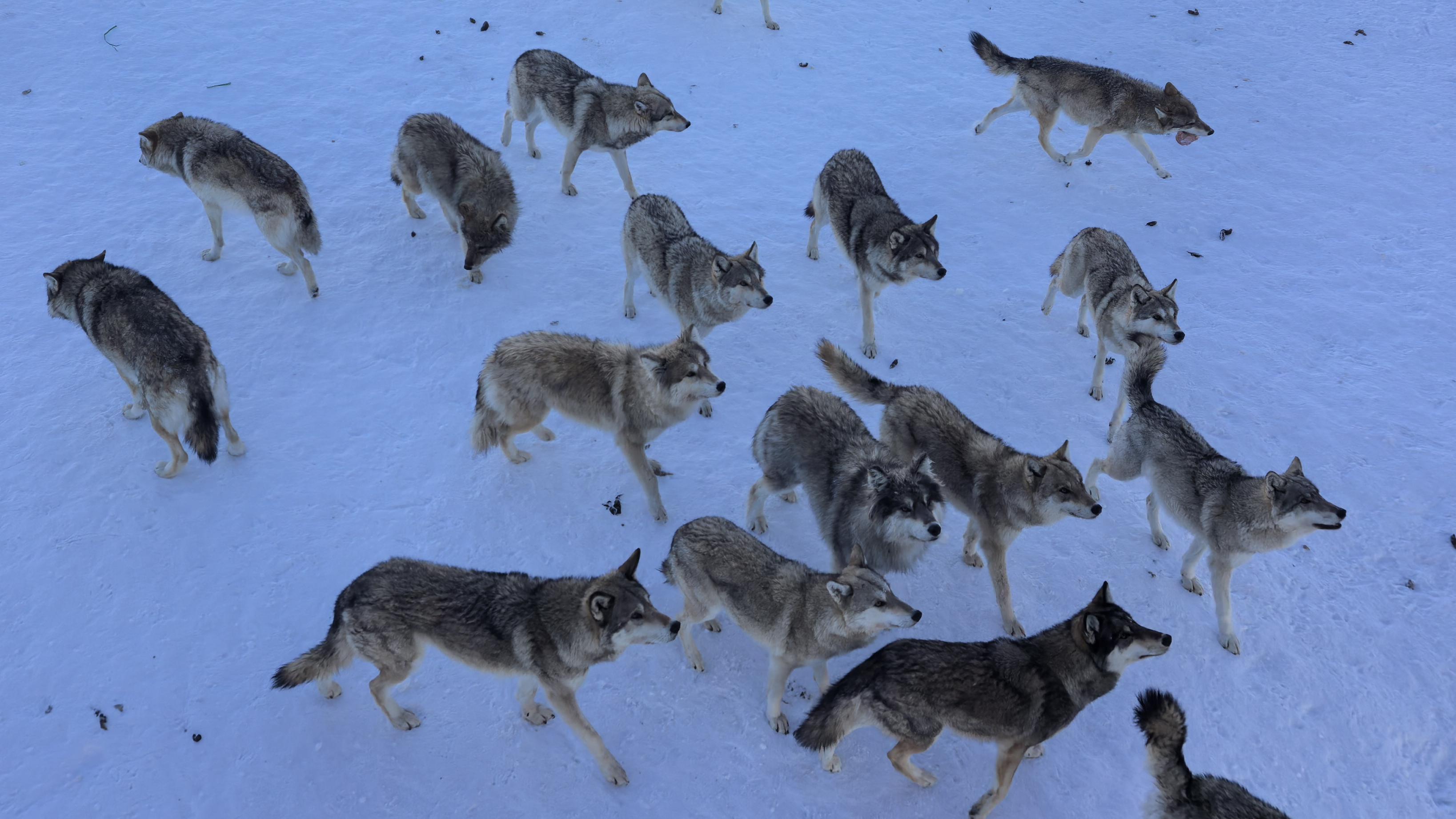 2025年12月25日,青格里狼山国际滑雪场旁西北狼园里的狼群在等待游客投喂。新华社记者 王立明 摄