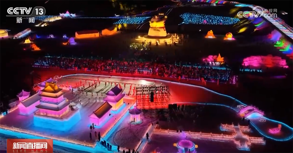 临近零点,一场融合科技光影与民族歌舞的跨年演出在晶莹闪烁的冰雕舞台上精彩亮相。