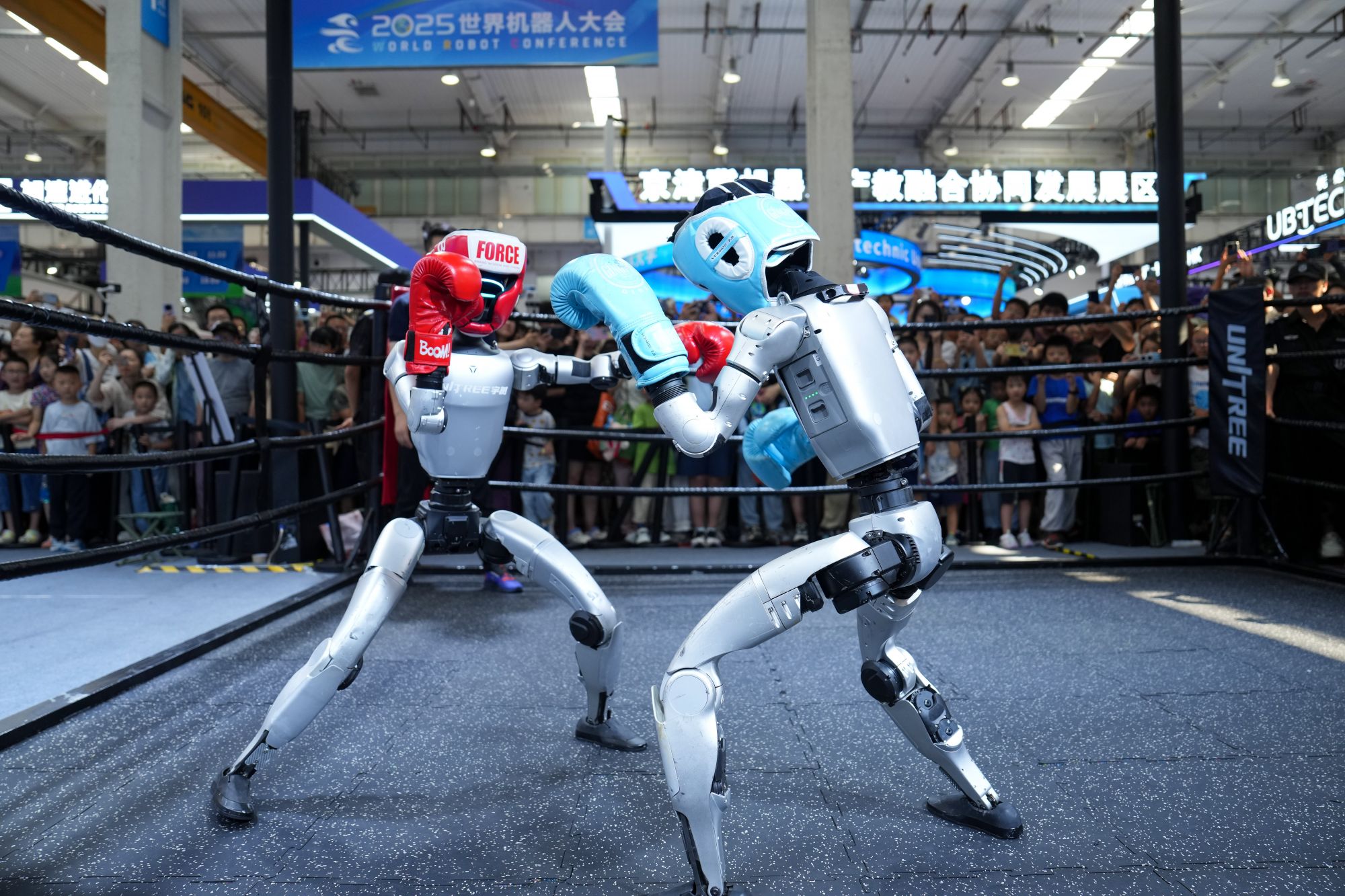 2025年8月11日,在世界机器人大会展馆内,观众在宇树机器人展台观看机器人拳击展示。新华社记者 鞠焕宗 摄