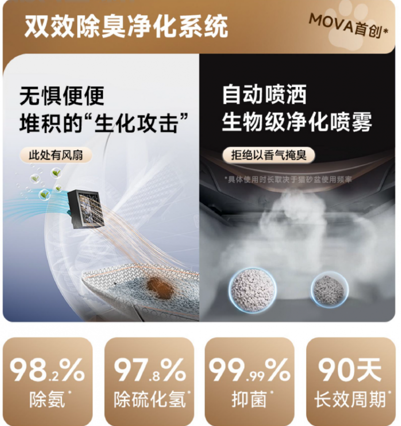 针对猫砂盆最大痛点——异味,MOVA LR10 Prime搭载“双效除臭净化系统”:一边通过高效风扇循环空气,一边自动喷洒生物级净化喷雾,实现98.2%除氨、97.8%除硫化氢,抑菌率高达99.99%,长效维持90天清新。配合11L封闭式集便仓,可储存60+团便便,支持15天无需清理。主球仓带防粘涂层,一冲即净;易拉提手设计,1秒速拆,清洁又省力。