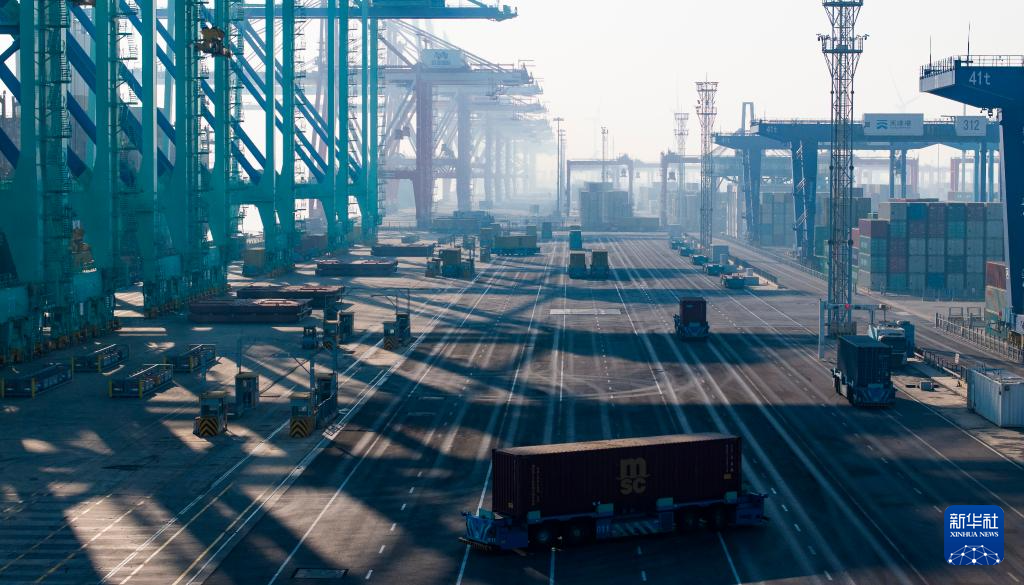 1月3日,天津港第二集装箱码头的场桥在运输集装箱。新华社记者 赵子硕 摄