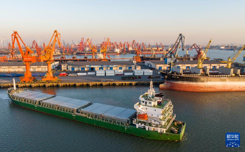 1月2日,一艘货轮从天津港第一港埠有限公司码头离泊(无人机照片)。新华社记者 赵子硕 摄