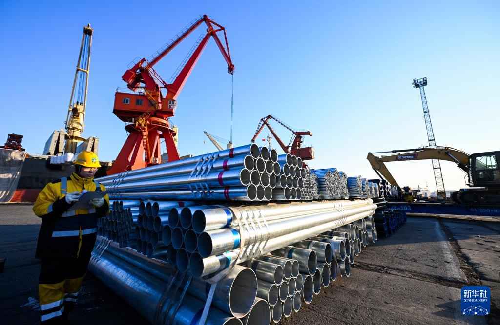 1月2日,天津港第一港埠有限公司码头理货员在货场清点货物。新华社记者 赵子硕 摄