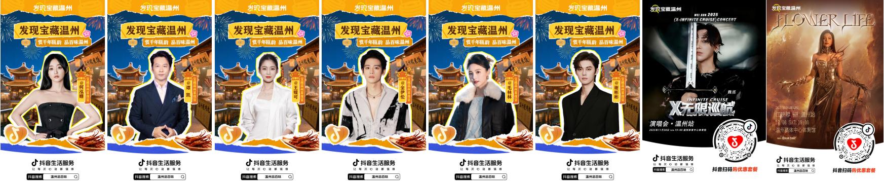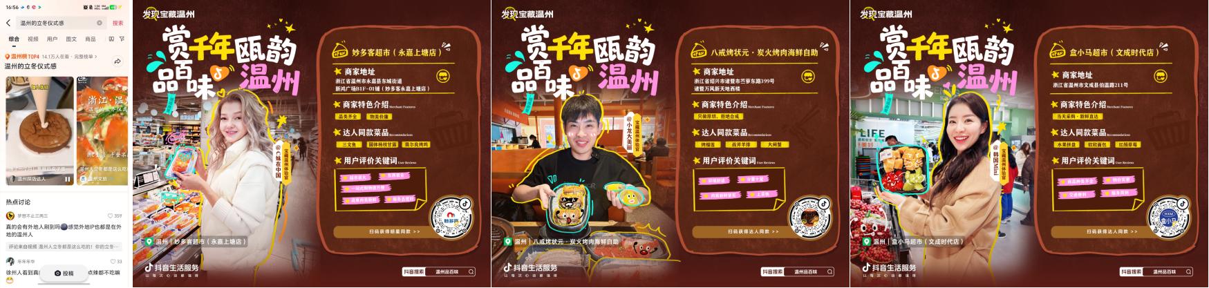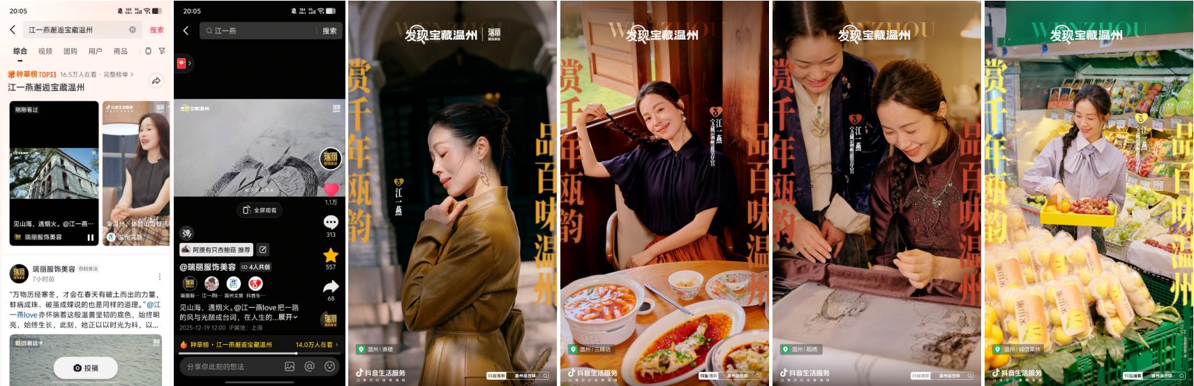 除城市海报之外,抖音生活服务还携手温州文旅及瑞丽杂志,特邀江一燕拍摄温州城市宣传片,全方位展现温州特色美食、非遗文化、城市风貌等核心魅力的同时,成功强化“宝藏温州”城市IP认知,江一燕相关视频播放量突破100w+,让参与商户借助城市IP影响力实现品牌价值升级。