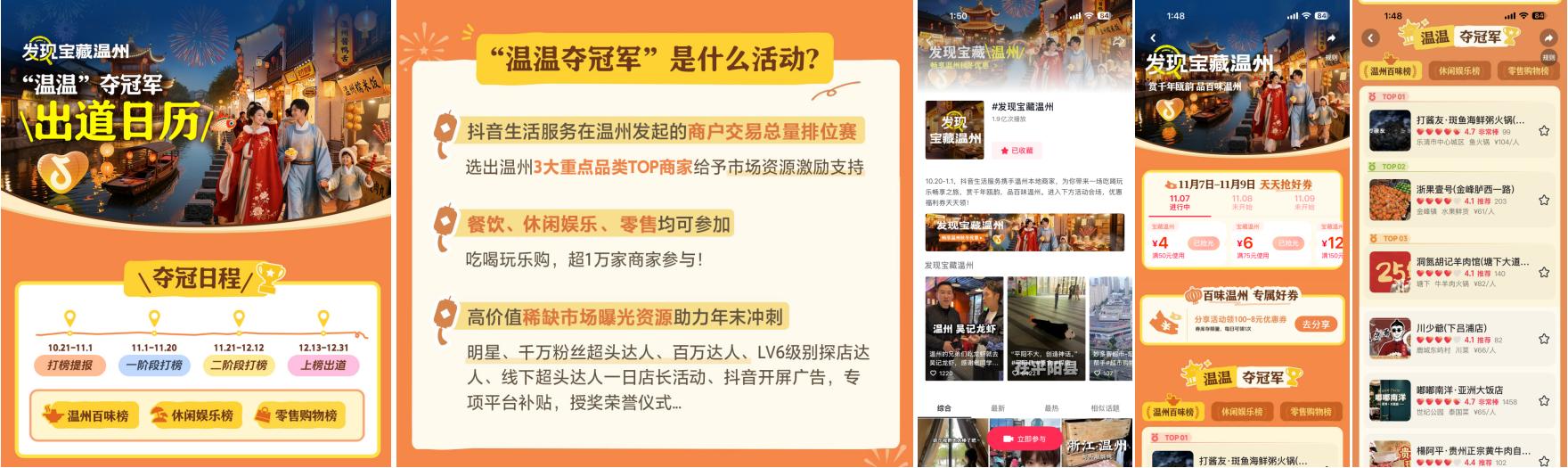 当千年瓯韵邂逅数字浪潮,当烟火商气碰撞全域流量,抖音生活服务「发现宝藏温州」城市级营销活动以“温温夺冠军”商家打榜赛为核心,构建起平台、商家、政府、用户多方共赢的商业生态链路。活动深度融合平台资源与商户成长需求,通过多元玩法联动文旅政务、明星达人,不仅有效提升温州本地消费市场活力,更通过多元玩法实现了商家声量与业绩的双重突破。